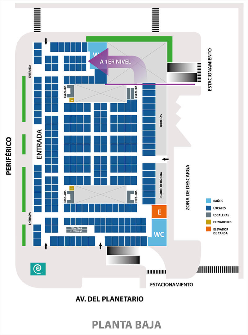 público, estacionamiento, área de comida, zona de tianguis etc.